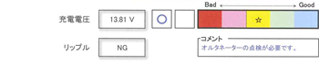 オルタネーター(発電機)テスト事例です。発電はされていますが、リップルに異常値が見られます。誤作動の原因になりますので、更に詳しい点検が必要です。