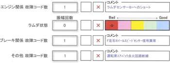 コントロールユニット診断事例です。数多くのセンサーなどから故障を見地した履歴が残されています。本事例では、ラムダセンサーは、故障コードのみではなくラムダセンサー本体の状態もチェックします。