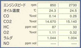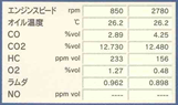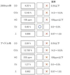 エンジン診断事例です。本事例は、ほぼすべて排気ガス組成に異常値が見られます。車検には通る範囲内ですが、不完全燃焼を起こしていますので、クルマのパフォーマンスの低下や燃費の悪化の原因となり、環境への悪影響も懸念されます。早急に原因を特定し修理する必要があります。